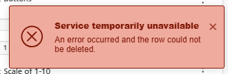 Service temporarily unavailable. An error occurred, and the row could not be deleted.