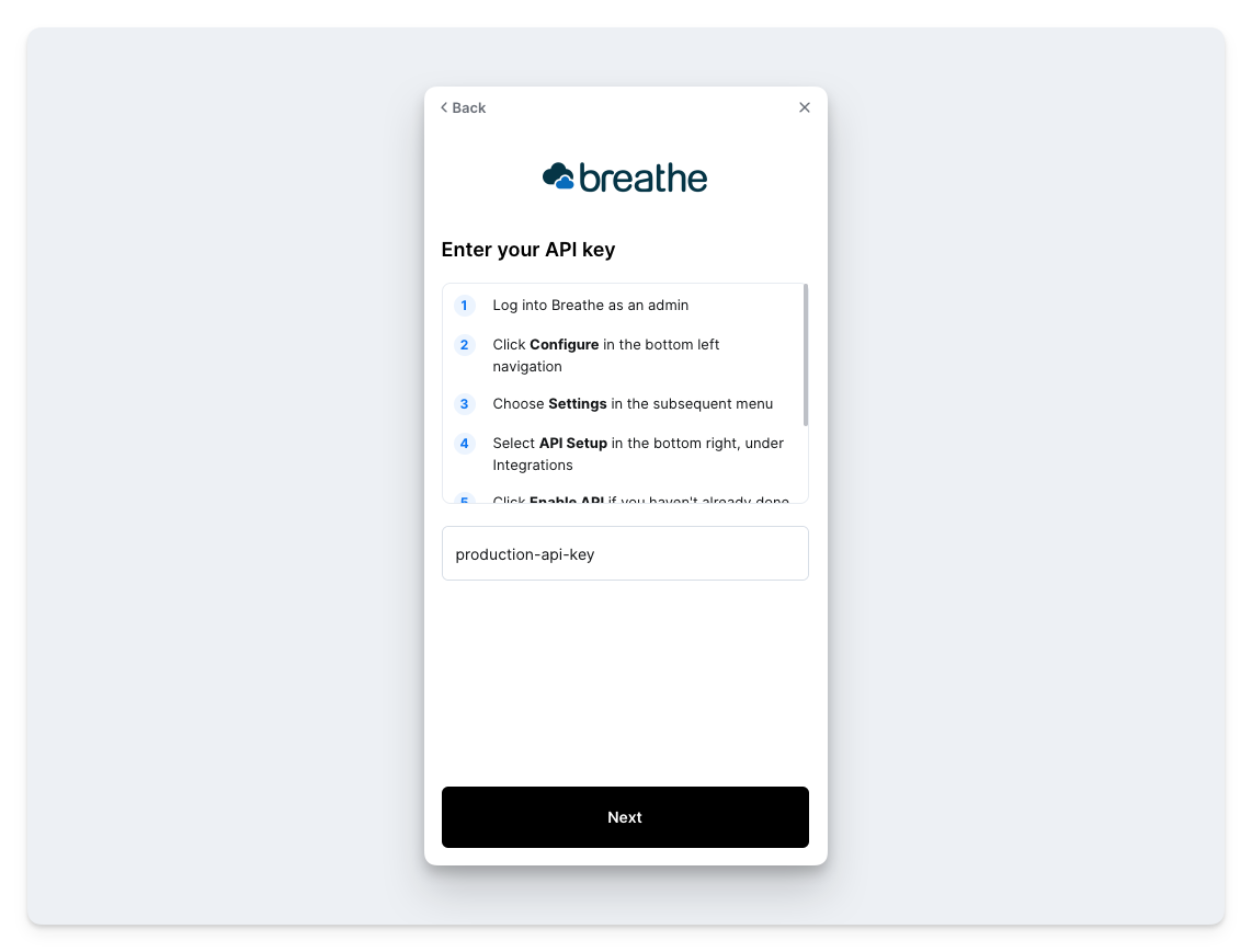 This guide will outline the steps needed to connect your Breathe account. To connect your Breathe account, you will need to provide an API key.