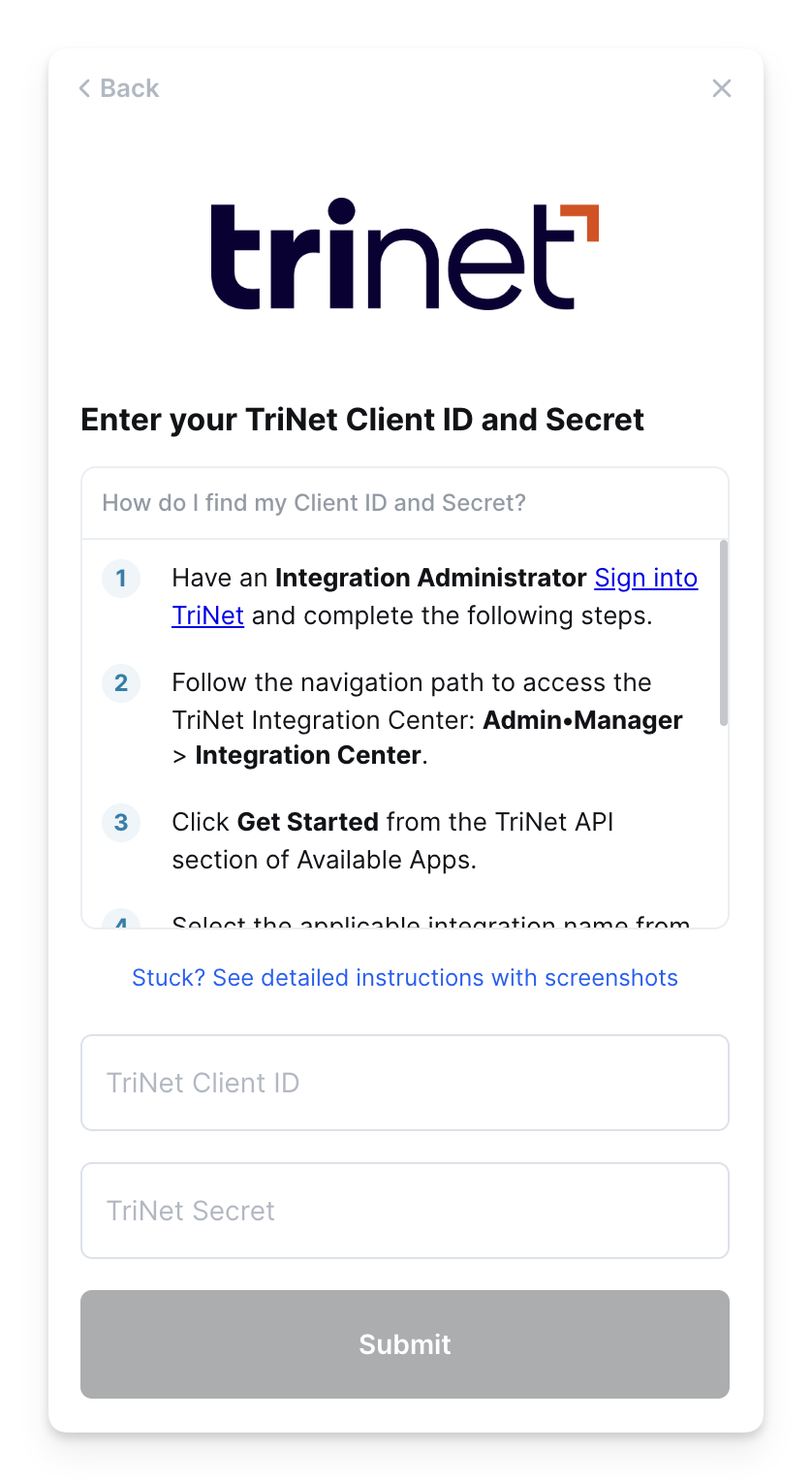 The TriNet integration requires a Client ID, Secret, and Company ID to authenticate. This guide will walk you through finding or creating those credentials within TriNet.