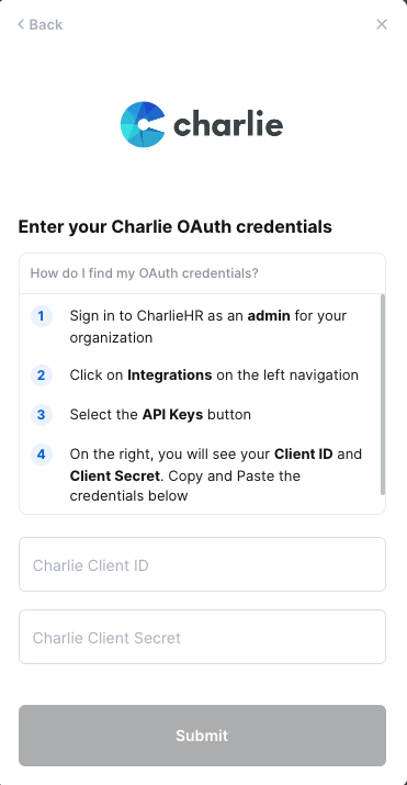 This guide will walk you through retrieving your Client ID and Secret in Charlie to complete your linking flow