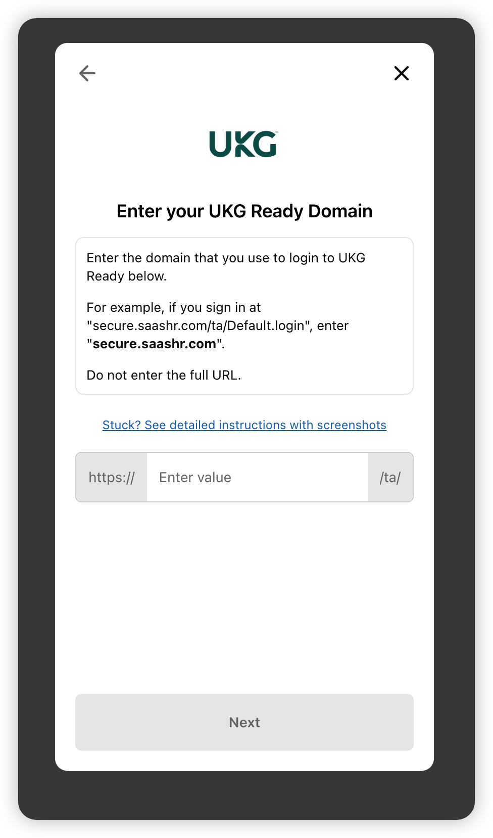 For example, if you sign in at "acme.com/ta/Default.login", enter "acme.com"