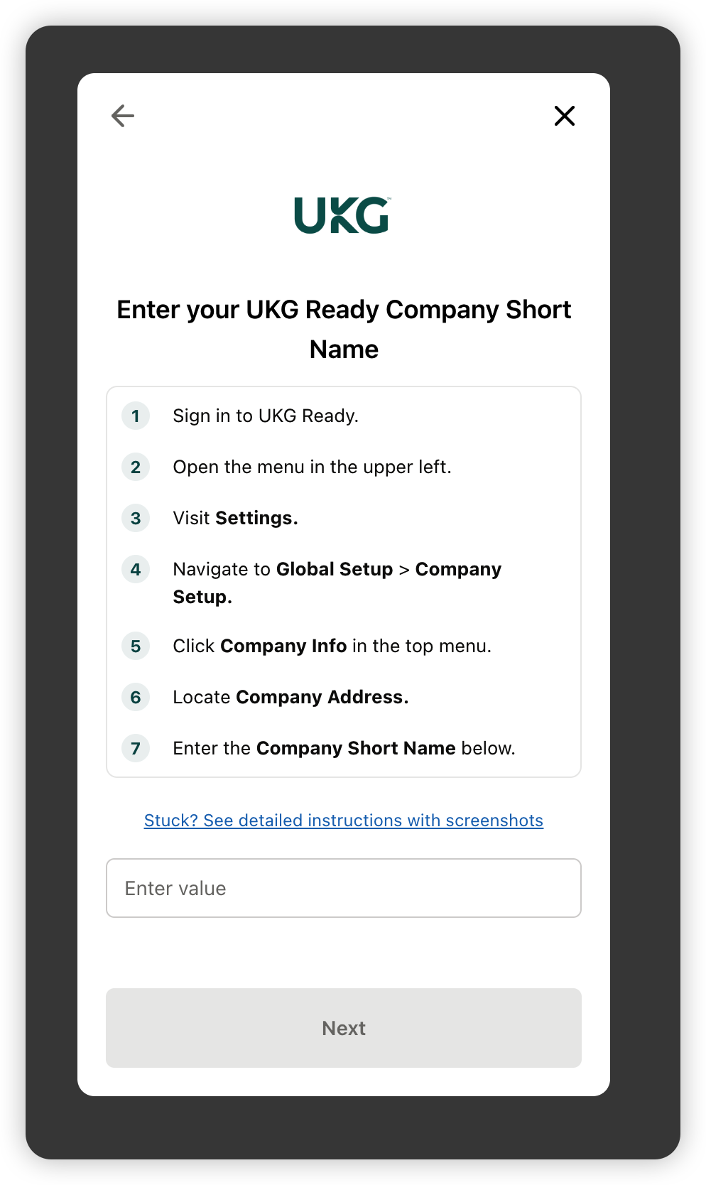 - Paste your Company Short Name in the linking flow and click Submit