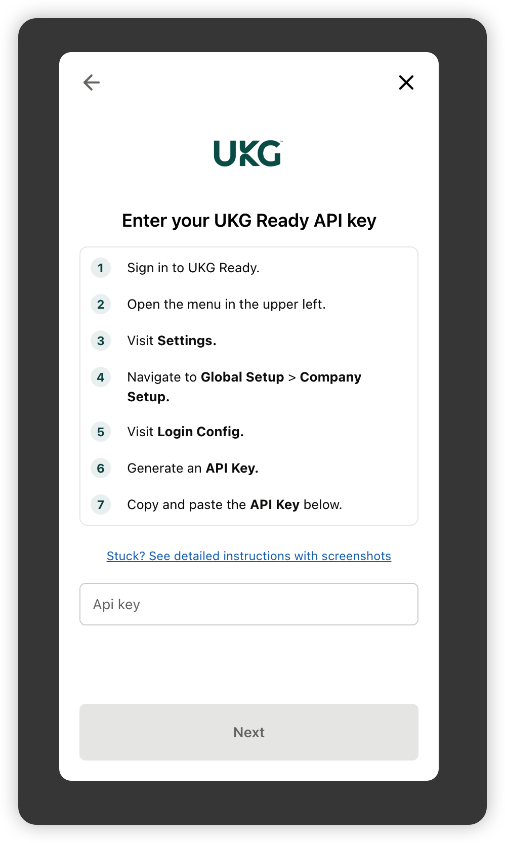 - Paste your API Key in the linking flow and press Submit