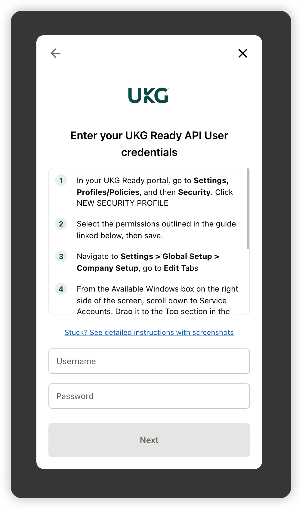 You're almost there! Now, just type in the User ID and Password of the Service Account you just created to complete the linking flow.