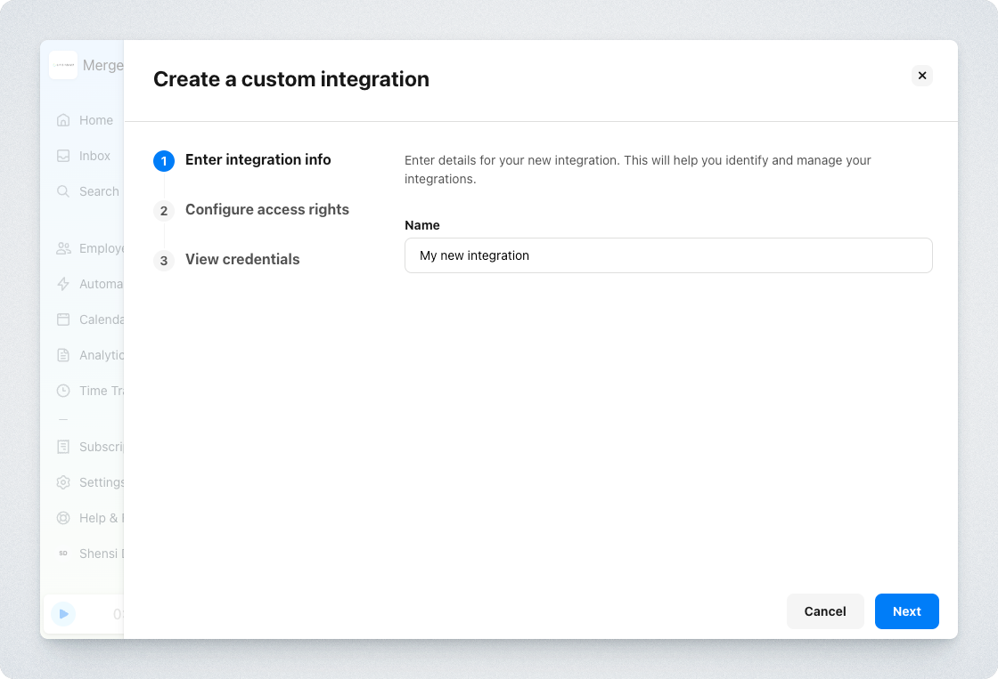 - Enter a name for your new integration and click Next in the bottom right corner of the page