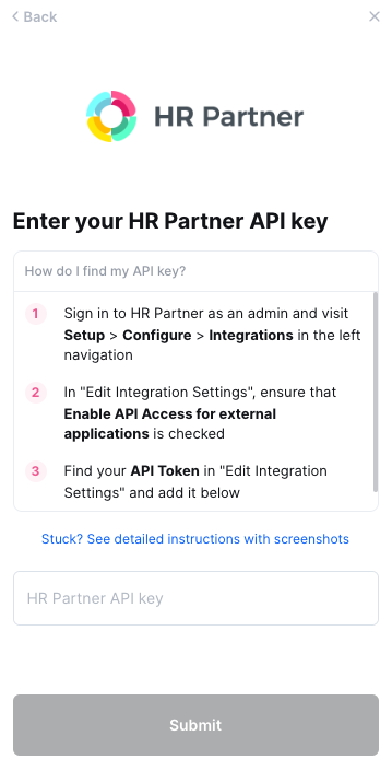 This guide will walk you through creating an API key within HR Partner and entering it into the linking flow