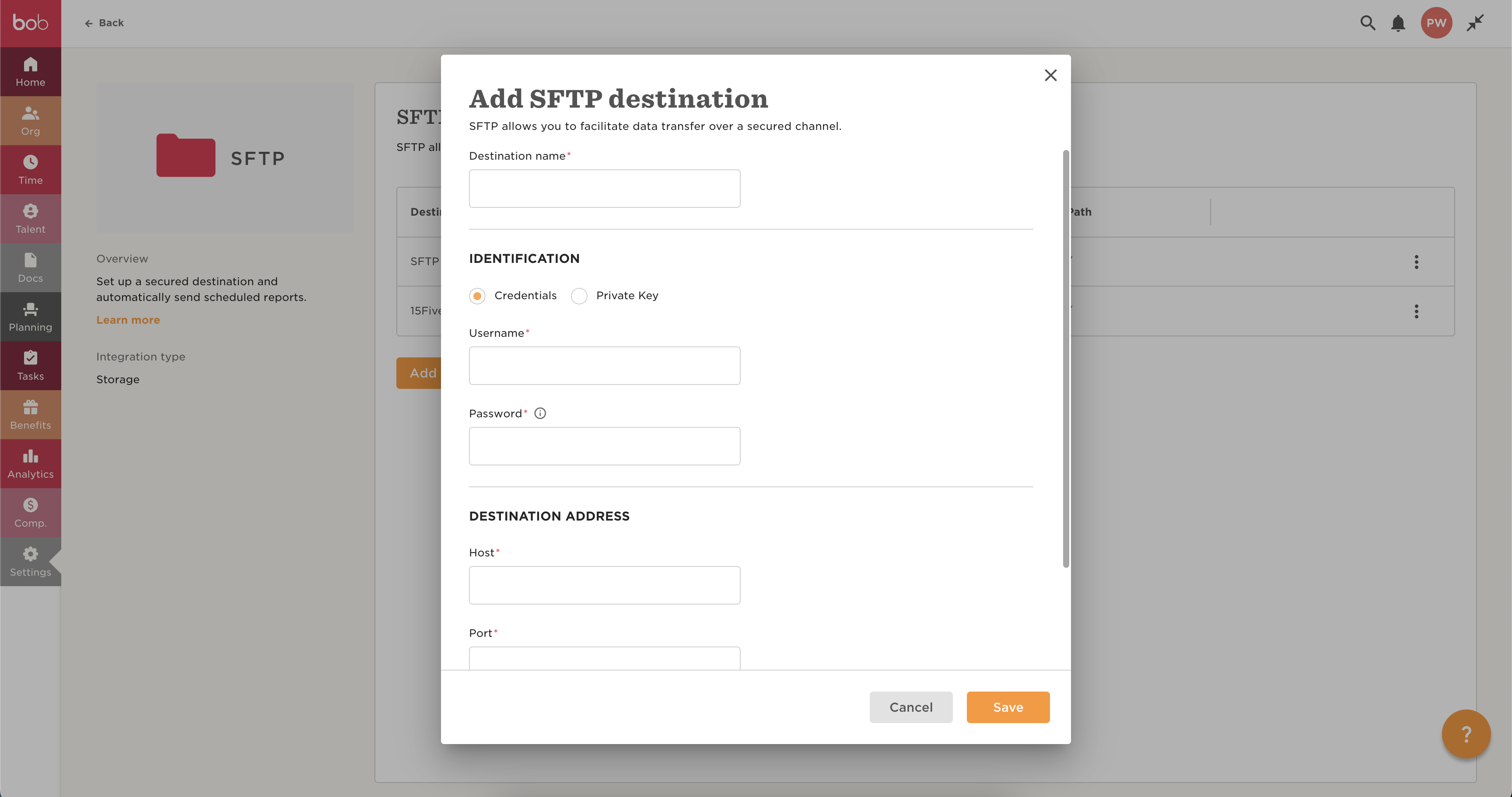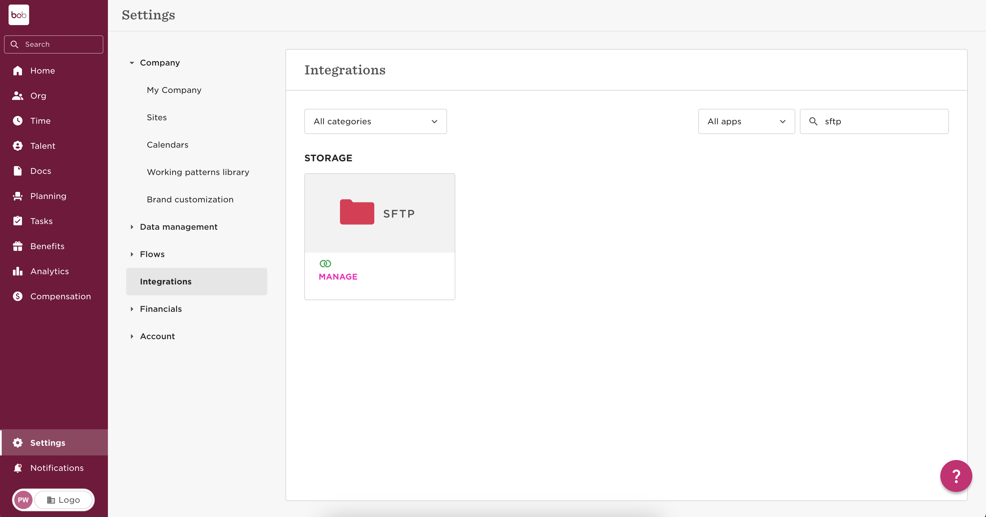 Note: If this is your first time setting up SFTP, HiBob will display Connect. If an SFTP destination has already been set up at least once, HiBob will display Manage.