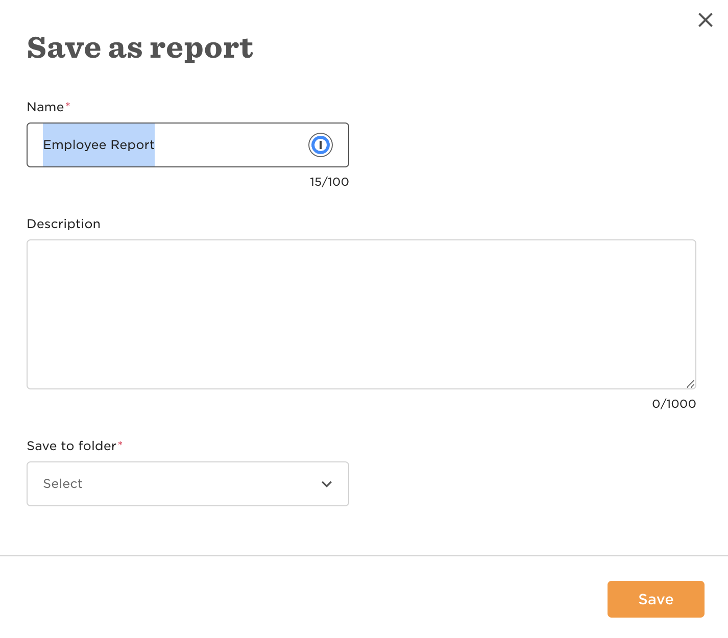- Enter the name for the report as "Employee_Information.csv" and add a description if necessary. Then, select the folder to save it in or create a new folder and click Save.