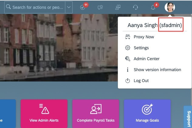 - To find your SAP SuccessFactors username, go to the upper right hand side and click on your profile image to view your username.
