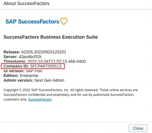 - To find your SAP SuccessFactors Company ID, in the same dropdown menu, click "Show version information." Locate Company ID in the modal that pops up: