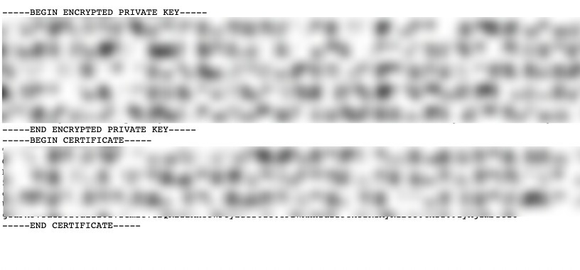 - Open up the "Certificate.pem" file that you downloaded previously in a text editor. The string between ——BEGIN ENCRYPTED PRIVATE KEY——- and —-END ENCRYPTED PRIVATE KEY——- is your Client Secret. Copy the Client Secret and save.